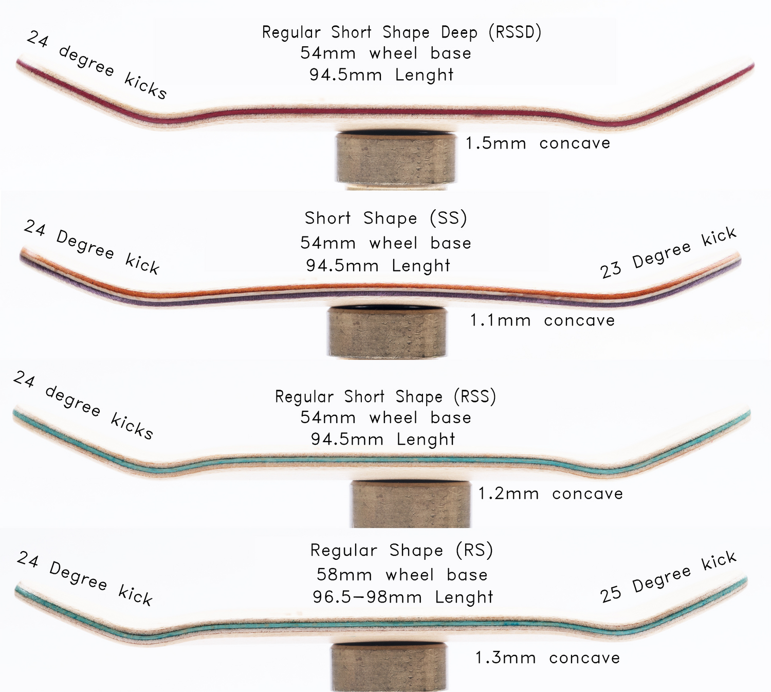 RWF decks have 4 unique shapes. For more information, please refer to the specifications or the photo breakdown.