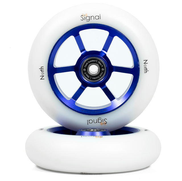 The Signal Wheels have been completely re-imagined for its third version. Even though they keep their simple and clean look, they're now machined out of a premium 7075 aluminum and feature North's ultimate urethane formula. The Signal wheels come in two different sizes; this size is 115mm in diameter, and 30mm in width. This size will provide a larger balance point for manuals and fakies (going backwards), but will also give wider decks more left/right clearance. This means you'll scrape less during a fakie, and you won't have to angle your scooter as much when you carve transition. North supports all their wheels with a lifetime warranty that covers chunks, and de-hubs.